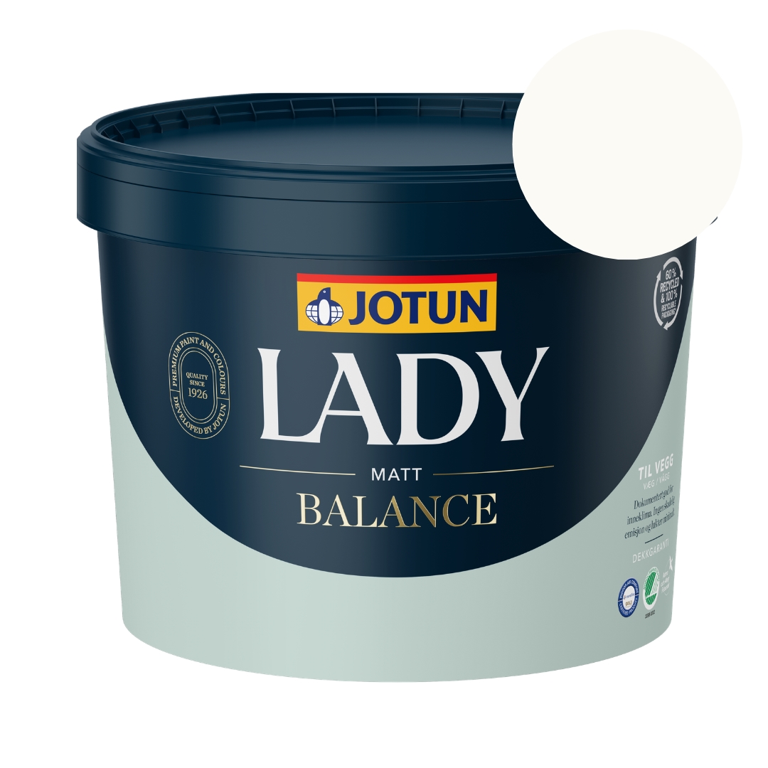 LADY Balance har længe været en af de bedst sælgende malinger, da den giver en mat finish, er meget slidstærk og robust og samtidig er indeklimacertificeret.